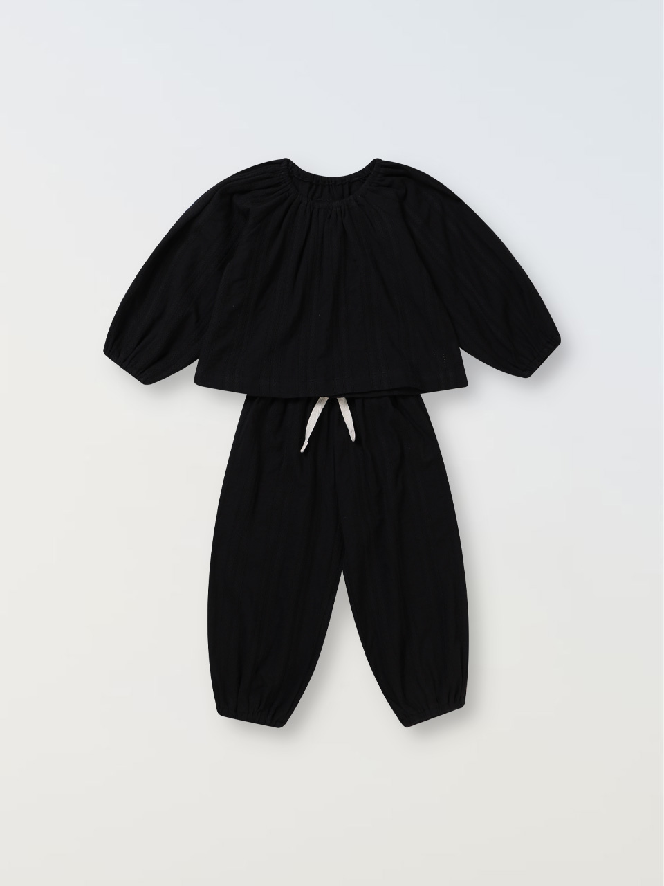 섬세한 스위스 자수 원단으로 완성된, 편안하면서도 고급스러운 무드의 셋업