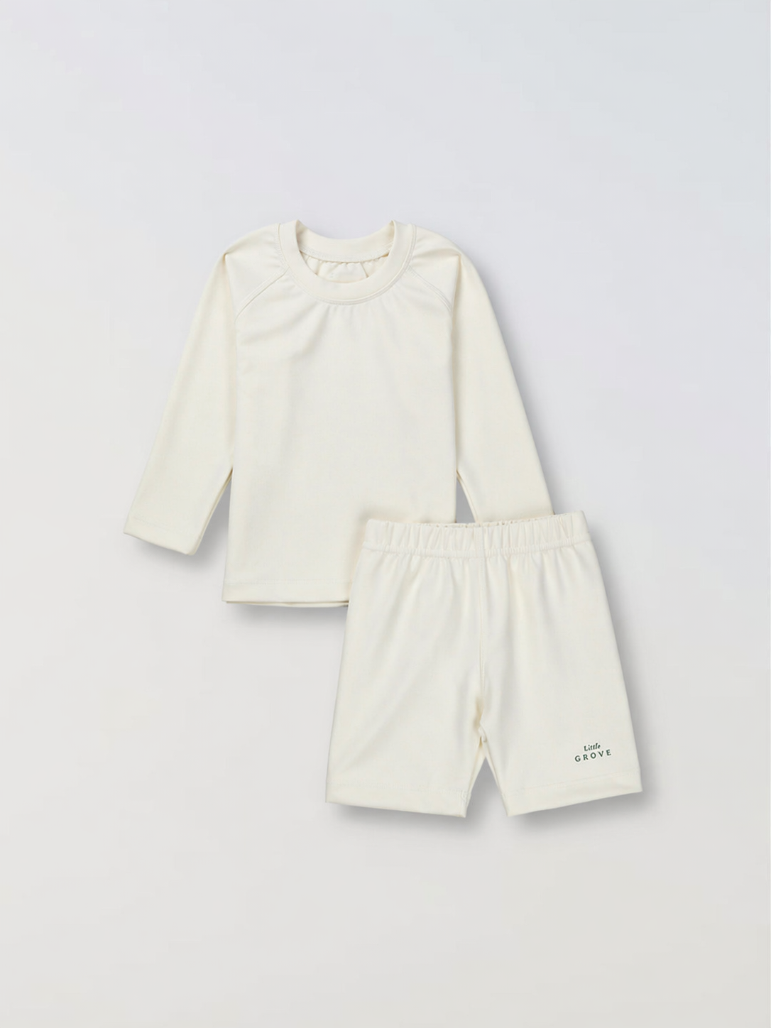 물놀이에 최적화된 기능성과 편안함을 담은리틀그로브의 래쉬가드 셋업입니다.