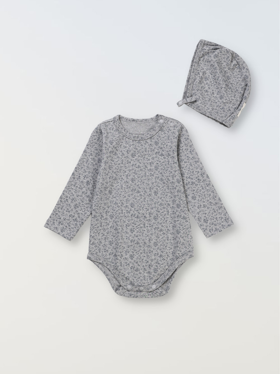 봄 시즌에 입기 좋은 코튼 후라이스 소재의 바디수트 & 보넷 세트입니다.