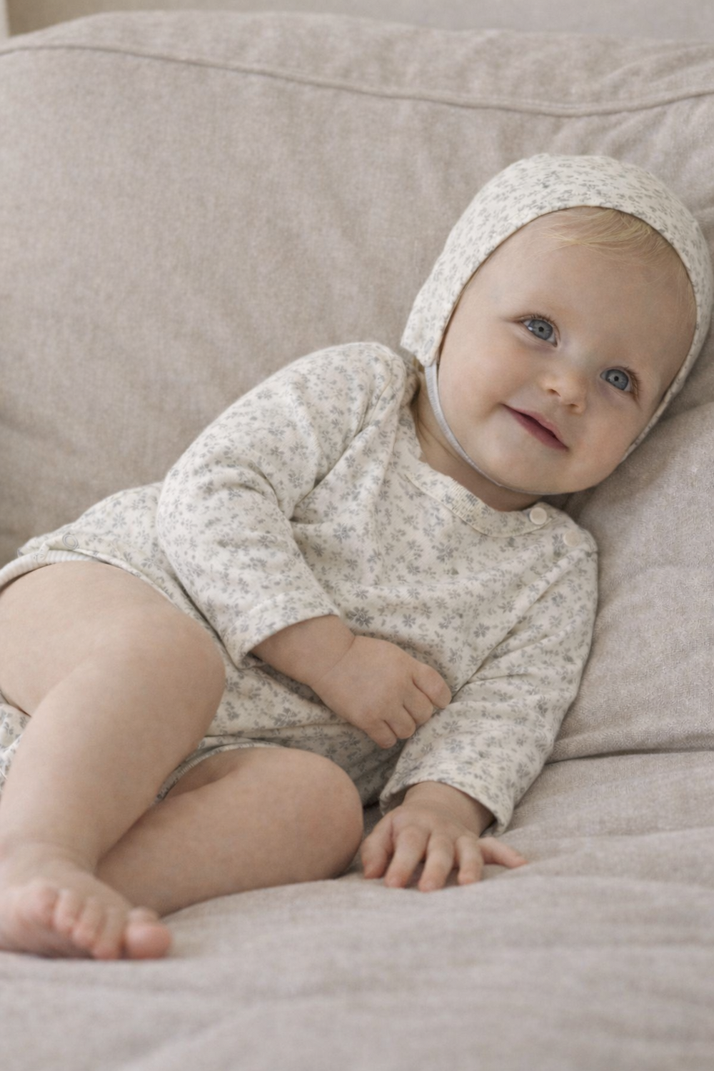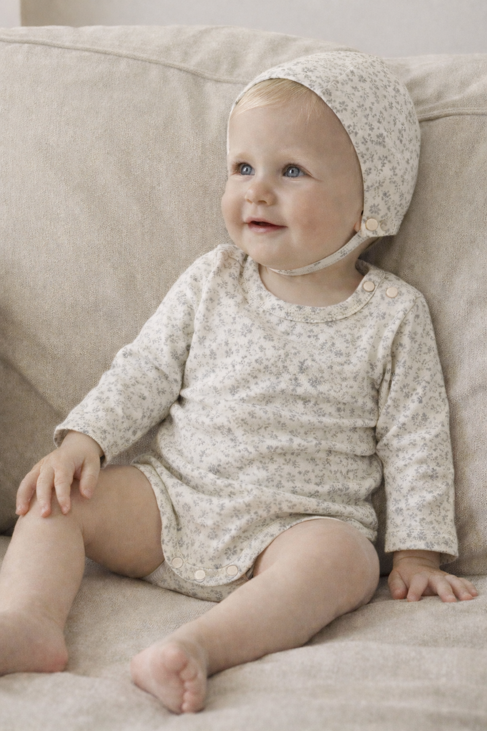봄 시즌에 입기 좋은 코튼 후라이스 소재의 바디수트 & 보넷 세트입니다.